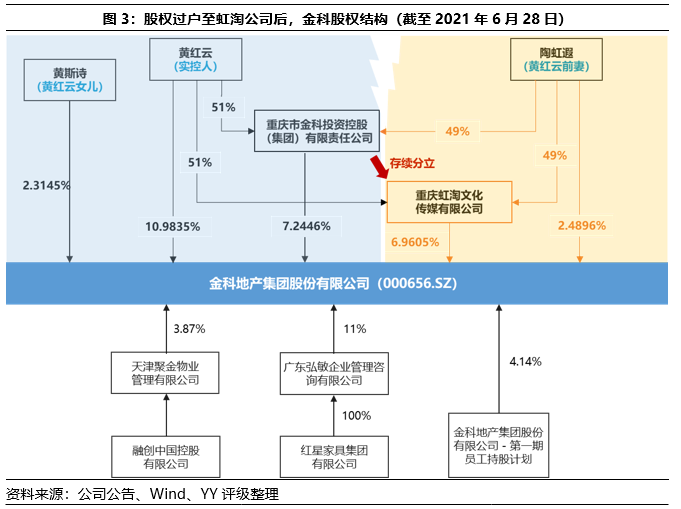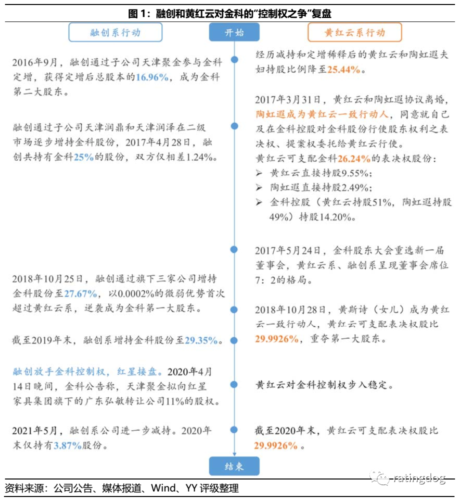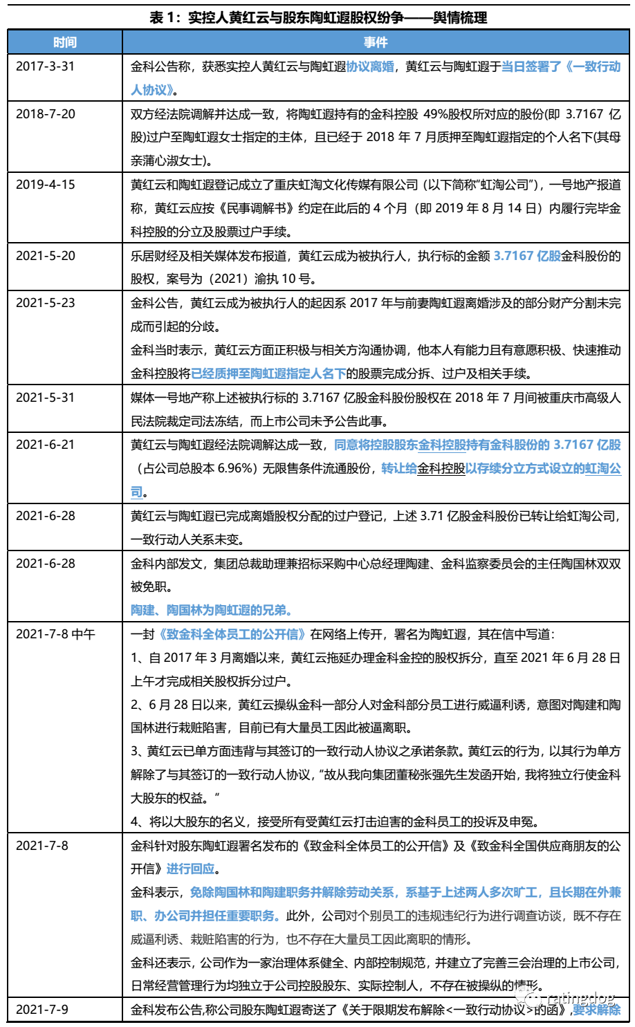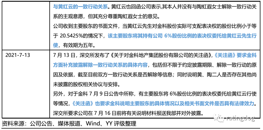 隨著2020年4月起融創(chuàng)放手,將所持11%金科股權(quán)轉(zhuǎn)讓給紅星家具集團(tuán)并進(jìn)一步減持,市場(chǎng)認(rèn)為黃紅云對(duì)金科控制權(quán)步入穩(wěn)定。但不料一年之后,黃紅云的家庭紛爭(zhēng)讓其控制權(quán)增添變數(shù),引發(fā)監(jiān)管發(fā)函詢問,上市公司的治理層面籠罩一層陰云。有關(guān)于黃紅云和前妻陶虹遐股權(quán)紛爭(zhēng)按時(shí)間順序梳理如下表。股權(quán)紛爭(zhēng)起源于雙方2017年離婚涉及的股權(quán)分配,但當(dāng)時(shí)正值“野蠻人”蹲守門外虎視眈眈,雙方離婚后結(jié)為一致行動(dòng)人,共御外敵,股權(quán)分割糾紛相對(duì)平靜。“野蠻人”離場(chǎng)后,分股計(jì)劃重新提上日程,內(nèi)部博弈開始。2021年5月,黃紅云因?yàn)檫t遲未完成股權(quán)分拆及過戶,成為被執(zhí)行人;2021年6月28日,雙方完成離婚股權(quán)分配的過戶登記,金科控股將所持3.7167億股金科股份轉(zhuǎn)讓給由金科控股通過存續(xù)分立方式設(shè)立的虹淘公司。就在同一天,金科解除了兩位高管陶建、陶國(guó)林的職務(wù),這兩位高管是陶虹遐的兄弟,引發(fā)陶虹遐反擊,陶虹遐發(fā)布《致金科全體員工的公開信》,并向董秘寄送了《關(guān)于限期發(fā)布解除<一致行動(dòng)協(xié)議>的函》,要求解除與黃紅云的一致行動(dòng)關(guān)系。至此,離婚財(cái)產(chǎn)分配糾紛上升至一致行動(dòng)關(guān)系破裂。甚至引發(fā)深交所關(guān)注,向公司發(fā)函,要求披露解除一致行動(dòng)關(guān)系的具體內(nèi)容,并要求公司于7月16號(hào)前反饋材料并對(duì)外披露。截至本報(bào)告日,公司尚未披露答復(fù)。02 對(duì)黃紅云實(shí)控權(quán)的影響