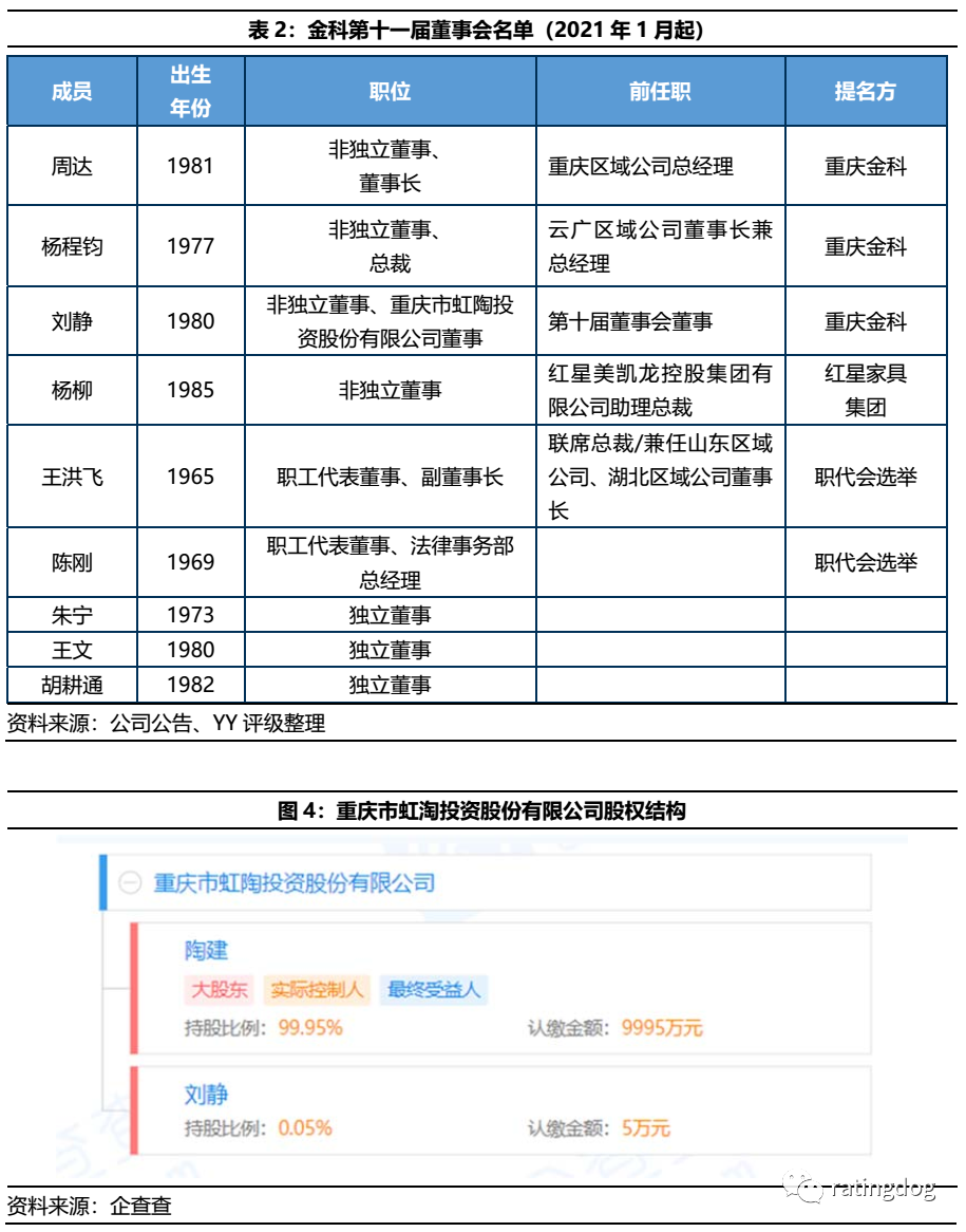 經(jīng)營(yíng)邊際來看,公司上半年銷售和回款正常,土儲(chǔ)充足,在19年擴(kuò)張中加大城市下沉,導(dǎo)致目前尚存約四成土儲(chǔ)位于三線及以下城市。20年至21Q1,公司有意提升拿地城市能級(jí),僅從2021Q1新獲土儲(chǔ)來看,公司保持了大本營(yíng)重慶的優(yōu)勢(shì),但在其他城市的土儲(chǔ)質(zhì)量則存在分化。財(cái)務(wù)方面,公司三道紅線指標(biāo)在2020年末快速轉(zhuǎn)綠,即得益于債務(wù)受控和經(jīng)營(yíng)回款,也依靠物業(yè)子公司分拆上市、發(fā)行永續(xù)債和增加少數(shù)股東權(quán)益等手法。與此同時(shí),公司表內(nèi)融資結(jié)構(gòu)惡化值得關(guān)注,而YY之前深度報(bào)告所述的表外債務(wù)風(fēng)險(xiǎn)也并未緩解。黃紅云與融創(chuàng)對(duì)金科地產(chǎn)集團(tuán)股份有限公司(以下簡(jiǎn)稱“金科”或“公司”)的“控制權(quán)之戰(zhàn)”打了近四年,中途黃紅云曾對(duì)媒體堅(jiān)定表示“金科就是我的生命”,“個(gè)人不會(huì)放棄公司控制權(quán)”,他通過和前妻+女兒結(jié)為一致行動(dòng)人、修改公司章程掌控董事會(huì)等操作,并留有至高可達(dá)9%股比的員工持股計(jì)劃作為后手,最終贏下了這場(chǎng)明爭(zhēng)暗斗。