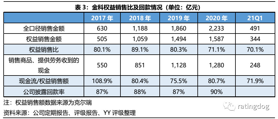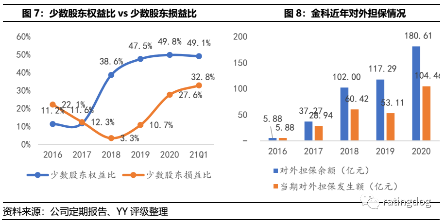 另一方面,指標(biāo)快速“轉(zhuǎn)綠”固然得益于有息債務(wù)被限制增長(zhǎng),但更主要的原因是2020年末凈資產(chǎn)同比增厚213.5億元,主要方式包括:(2)2020年11月公司分拆控股子公司金科服務(wù)到香港聯(lián)交所上市(2020年末公司持股52.33%),帶來資本公積增加約30億元;(3)發(fā)行永續(xù)債,2020年末永續(xù)債余額21.42億元,較2019年末增長(zhǎng)13.42億元。(4)加大合作開發(fā),少數(shù)股東權(quán)益增加118億元。公司近兩年的少數(shù)股東權(quán)益占比已接近一半,規(guī)模較大,而且2020年少數(shù)股東損益比約27.6%,跨期對(duì)比不匹配,潛在為非股比分配特征,“明股實(shí)債”嫌疑較大。而且公司存在造表痕跡,僅2020年,金科就將8家子公司移出表內(nèi),理由為“少數(shù)股東增資或根據(jù)相關(guān)補(bǔ)充約定而導(dǎo)致公司喪失控制權(quán)”,這8家子公司全部虧損。近年公司及其子公司對(duì)外擔(dān)保余額攀升明顯,截至2020年末達(dá)181億元,如同之前深度報(bào)告所述,表外債務(wù)風(fēng)險(xiǎn)值得關(guān)注,而且并未緩解。距離“門口野蠻人”融創(chuàng)退場(chǎng)僅過去一年多,金科兩大股東的離婚財(cái)產(chǎn)分配糾紛已上升至一致行動(dòng)關(guān)系破裂。截至本報(bào)告日,公司尚未就深交所關(guān)注函要求,披露解除一致行動(dòng)關(guān)系的具體內(nèi)容。我們根據(jù)目前信息推測(cè),解除一致行動(dòng)人后,黃紅云仍可保住金科實(shí)控人地位,董事會(huì)中黃紅云的話語權(quán)也更勝一籌。但是金科股權(quán)結(jié)構(gòu)分散,實(shí)控人持股比例相對(duì)少,始終留有隱患;且關(guān)注其近年來股權(quán)紛爭(zhēng)不斷,真實(shí)掌控力可能也顯著受影響,股權(quán)端的風(fēng)險(xiǎn)不可忽視,這個(gè)后續(xù)會(huì)影響生存策略的選擇,會(huì)有階段性短視行為和利益的重分配,造成公司財(cái)務(wù)政策的波動(dòng)顯著放大。經(jīng)營(yíng)邊際來看,公司銷售回款正常,有息債務(wù)規(guī)模也被“做表”控制住了,三道紅線指標(biāo)在債務(wù)受限、物業(yè)子公司分拆上市、永續(xù)債、少數(shù)股東權(quán)益增厚的共同作用下轉(zhuǎn)綠,但是考慮表外風(fēng)險(xiǎn)只是調(diào)整的一個(gè)手段,整體的財(cái)務(wù)上的穩(wěn)健性存疑。目前觀察點(diǎn)在于,土儲(chǔ)周轉(zhuǎn)正常,如股權(quán)紛爭(zhēng)告一段落,且不影響財(cái)務(wù)如分家等短期利益分配的事情,公司的邊際惡化可止住。未來需持續(xù)觀察。
