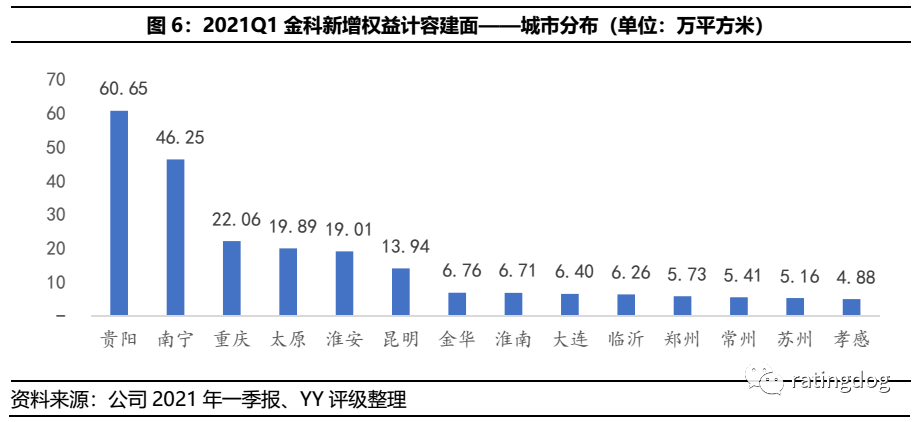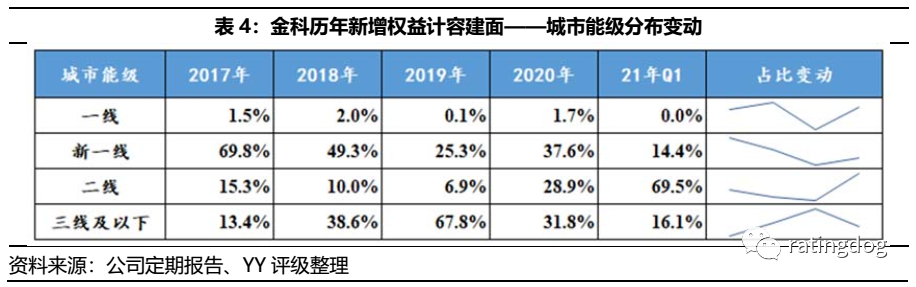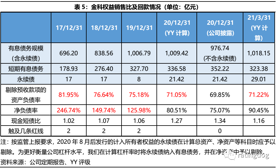 2021年1-6月,金科及所投資的公司實(shí)現(xiàn)銷售額約1,021億元,同比增長(zhǎng)17.6%;銷售面積約1,005萬平方米,同比增長(zhǎng)16.9%。按照2021年銷售目標(biāo)計(jì)劃(不低于2,500億元),上半年完成全年目標(biāo)的41%。下半年是發(fā)力推盤還是動(dòng)態(tài)調(diào)整銷售目標(biāo)仍需觀察。在合作開發(fā)成為行業(yè)趨勢(shì)的背景下,公司權(quán)益銷售比下滑到70%左右,仍保持較高水平。在公司推行的一年現(xiàn)金流回正的“高周轉(zhuǎn)”策略下,2020年回款率達(dá)到90%。21年一季度未披露銷售回款,但是對(duì)比銷售商品、提供勞務(wù)收到的現(xiàn)金和公司的權(quán)益銷售額,占比約71.9%,雖然低于2020年水平,但縱向來看波動(dòng)不大。土地儲(chǔ)備方面,截至21年3月末,公司全口徑剩余可售建筑面積為7,145.48萬平方米,較2020年末基本持平,按2020年簽約銷售面積估算,可支撐未來3年銷售,土儲(chǔ)充足。但正如YY對(duì)金科的深度報(bào)告所述,公司在2019年擴(kuò)張中選擇加大城市下沉,導(dǎo)致尚存較大比例土儲(chǔ)位于三線及以下城市。截至21年3月末,公司一二線土儲(chǔ)占比約59%(以二線為主),三線及以下城市土儲(chǔ)占比約41%。低能級(jí)城市購(gòu)買力伴隨棚改紅利褪去,去化面臨一定壓力。邊際來看,2020年至今,公司有意提升拿地城市能級(jí);新增土地儲(chǔ)備按權(quán)益計(jì)容建筑面積計(jì)算,2020年二線(含新一線)城市占比約66%,21年Q1比例提升至84%。區(qū)位布局上,公司2021Q1在重慶新增22萬平方米權(quán)益計(jì)容建面,在4月份的首批集中供地土地拍賣中也有所斬獲,在房企競(jìng)爭(zhēng)中排名第6。其他主要的投拓項(xiàng)目位于貴陽經(jīng)開區(qū)(離城區(qū)較遠(yuǎn))、南寧市的青秀區(qū)和綜合保稅區(qū)、太原市清徐縣和淮安市清江浦區(qū)等。僅從2021Q1新獲土儲(chǔ)來看,公司保持了大本營(yíng)重慶的優(yōu)勢(shì),但在其他城市的土儲(chǔ)質(zhì)量則存在分化,不應(yīng)僅以城市能級(jí)作為評(píng)判標(biāo)準(zhǔn)。4.2 表內(nèi)外債務(wù)風(fēng)險(xiǎn)