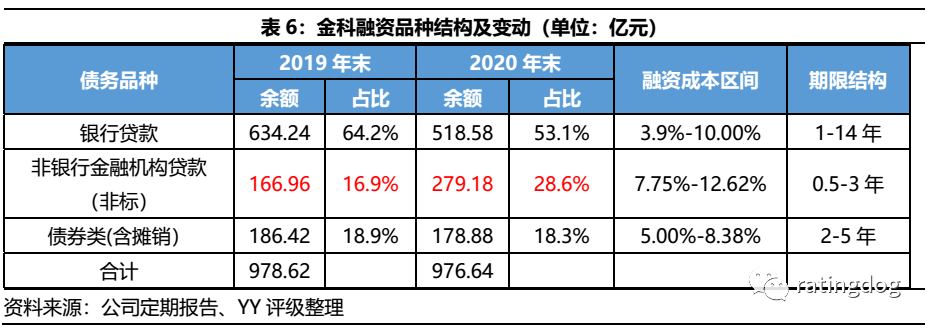 過去幾年金科有息債務(wù)快速增長(zhǎng),“三道紅線”政策出臺(tái)以來,公司有息債務(wù)規(guī)模得到控制,僅小幅增加。全部監(jiān)管指標(biāo)在一年內(nèi)“神奇”達(dá)標(biāo),按公司披露,2020年末、2021年一季度末保持在綠檔。債務(wù)總額受控,公司表內(nèi)融資結(jié)構(gòu)惡化。2020年成本較高的非標(biāo)貸款占比增長(zhǎng)至28.6%,金額大幅增加112億元,與此同時(shí)銀行貸款減少116億元。