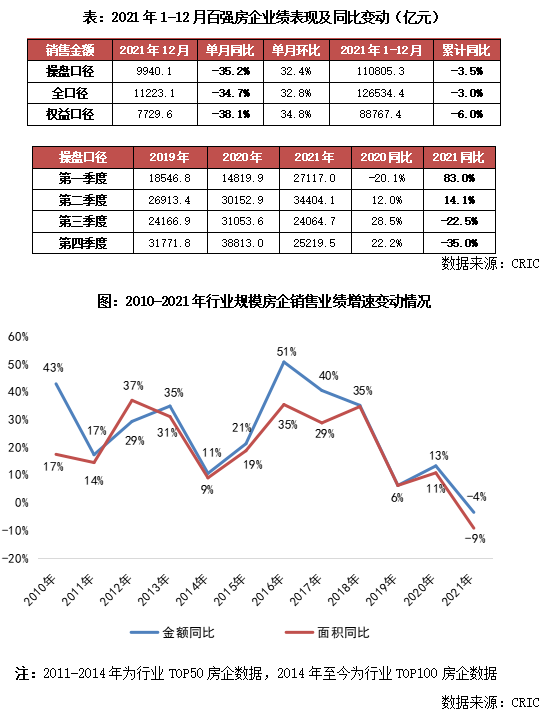 2021年12月,TOP100房企實(shí)現(xiàn)銷售操盤金額9940.1億元,單月業(yè)績(jī)同比降低35.2%,較11月環(huán)比增長(zhǎng)32.4%。從累計(jì)業(yè)績(jī)來(lái)看,年內(nèi)百?gòu)?qiáng)房企累計(jì)業(yè)績(jī)?cè)鏊俪掷m(xù)放緩,截至12月末累計(jì)銷售操盤金額較2020年同比降低3.5%,規(guī)模房企銷售增速罕見出現(xiàn)負(fù)增長(zhǎng)。
