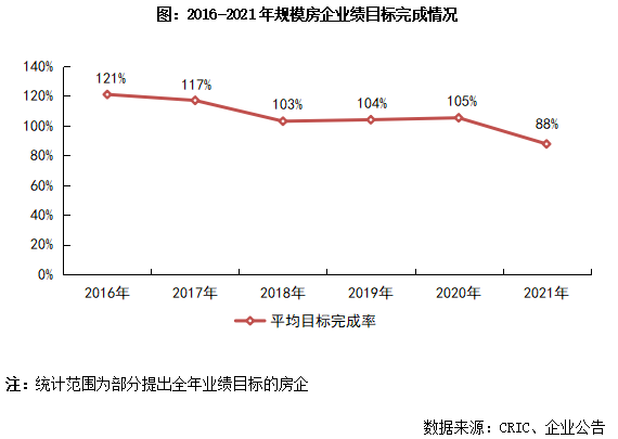2021年,規(guī)模房企整體的目標(biāo)完成情況遠(yuǎn)不及歷史同期,規(guī)模房企平均目標(biāo)完成率不到90%,明顯低于近年105%以上的平均水平。在披露年度業(yè)績(jī)目標(biāo)的部分規(guī)模房企中,截至12月末有逾8成房企未完成全年業(yè)績(jī)目標(biāo)。但綠城、華潤(rùn)、金地、濱江等房企仍超額完成全年目標(biāo)。可見,即使年內(nèi)規(guī)模房企已對(duì)業(yè)績(jī)?cè)鲩L(zhǎng)保持了謹(jǐn)慎預(yù)期,并適度調(diào)降了銷售目標(biāo)的情況下,但下半年市場(chǎng)大幅降溫、企業(yè)業(yè)績(jī)持續(xù)萎縮的影響下,多數(shù)企業(yè)的業(yè)績(jī)壓力仍然較大。
