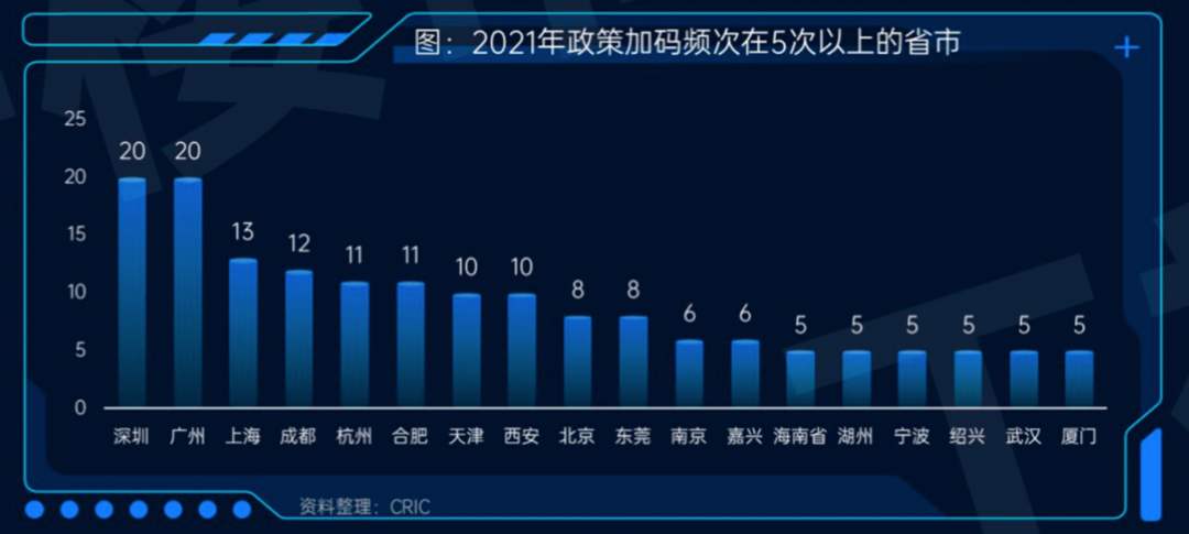 其中,深圳、廣州政策加碼多達20次,深圳重點強化信貸資金管控,并以“深房理”被查處作為政策加碼的最高峰;廣州分區(qū)域精準(zhǔn)化調(diào)控,天河、黃埔、南沙等熱點區(qū)域依據(jù)市場實際情況,針對性地調(diào)整政策措施;上海多管齊下嚴(yán)堵政策監(jiān)管漏洞,政策加碼同樣達到13次。