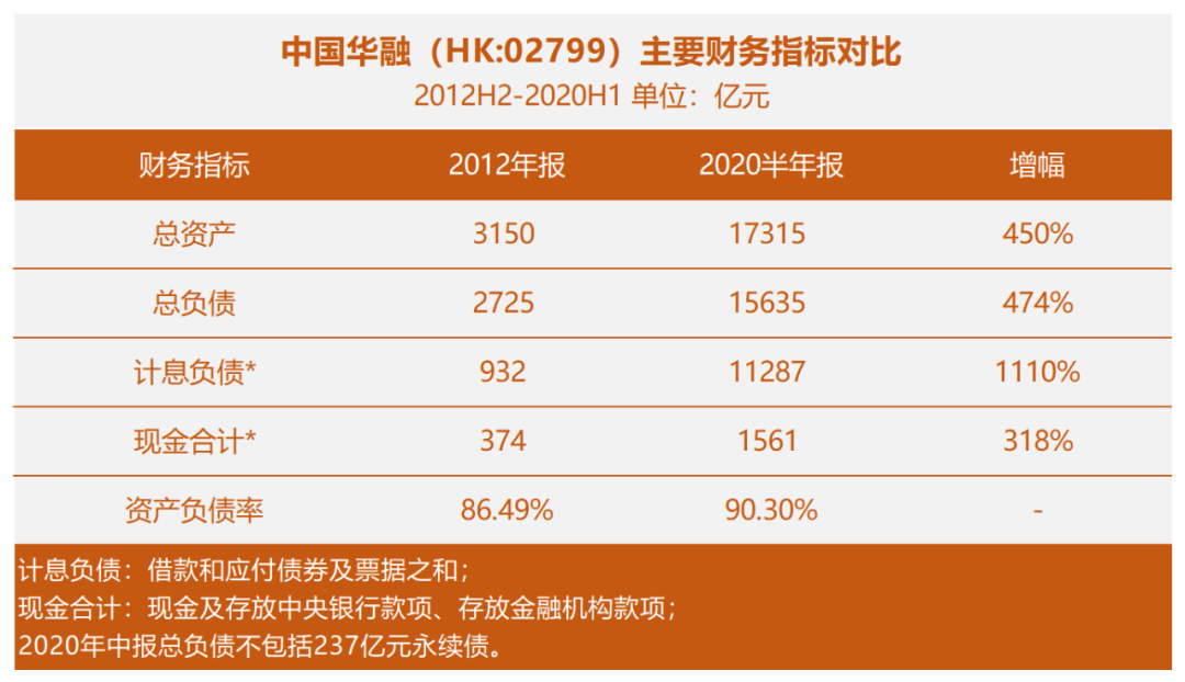 經(jīng)過二十多年的擴(kuò)張,華融已經(jīng)發(fā)展成為集各類金融牌照于一身的金融平臺(tái)。2020年上半年,中國華融總資產(chǎn)1.73萬億,總負(fù)債1.56萬億,資產(chǎn)負(fù)債率90.3%。