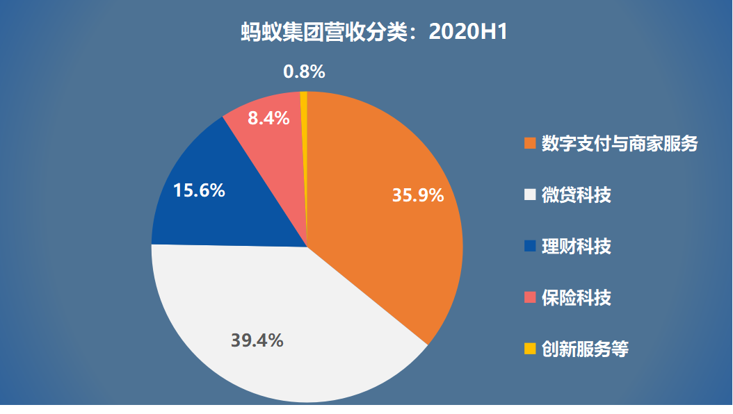 數(shù)字支付商戶服務(wù)收入和科技平臺(tái)業(yè)務(wù)(微貸+理財(cái)+保險(xiǎn))收入,在2020年半年報(bào)中,750億左右的營業(yè)收入中兩者的比例約為35:65。