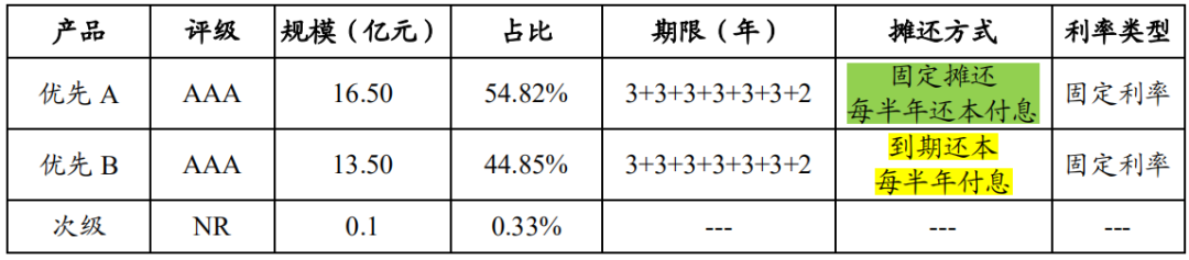 與其他基礎(chǔ)資產(chǎn)類型的ABN中,優(yōu)先A和優(yōu)先B區(qū)別或者在于到期日不同,或者在于債項(xiàng)評(píng)級(jí)不同,或者兩者兼有。但是在CMBN中,優(yōu)先A和優(yōu)先B區(qū)別主要在于本金的攤還方式,一般情況下,優(yōu)先A本金固定攤還,優(yōu)先B本金則實(shí)行到期一次性還本。