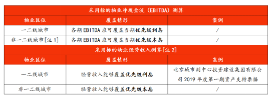 注1:一、二線和非一、二線物業(yè)均入池,且以一、二線物業(yè)為主的,按照一二線城市要求測(cè)算優(yōu)先級(jí)利息覆蓋倍數(shù)