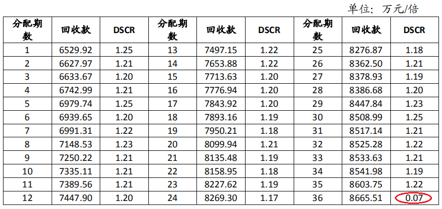 以“北京城市副中心投資建設(shè)集團(tuán)有限公司2019年度第一期資產(chǎn)支持票據(jù)”為例,最后一期回收款對(duì)優(yōu)先級(jí)證券的應(yīng)付本息覆蓋倍數(shù)僅有0.07倍,可以推測(cè),最后一期的優(yōu)先級(jí)證券本金明顯較大。聯(lián)合評(píng)級(jí)披露,本交易優(yōu)先級(jí)票據(jù)的到期本息償付將依賴于發(fā)起機(jī)構(gòu)的再融資能力或抵押物處置變現(xiàn)價(jià)值,故聯(lián)合資信對(duì)于本交易 DSCR 測(cè)算不考慮最后年份。