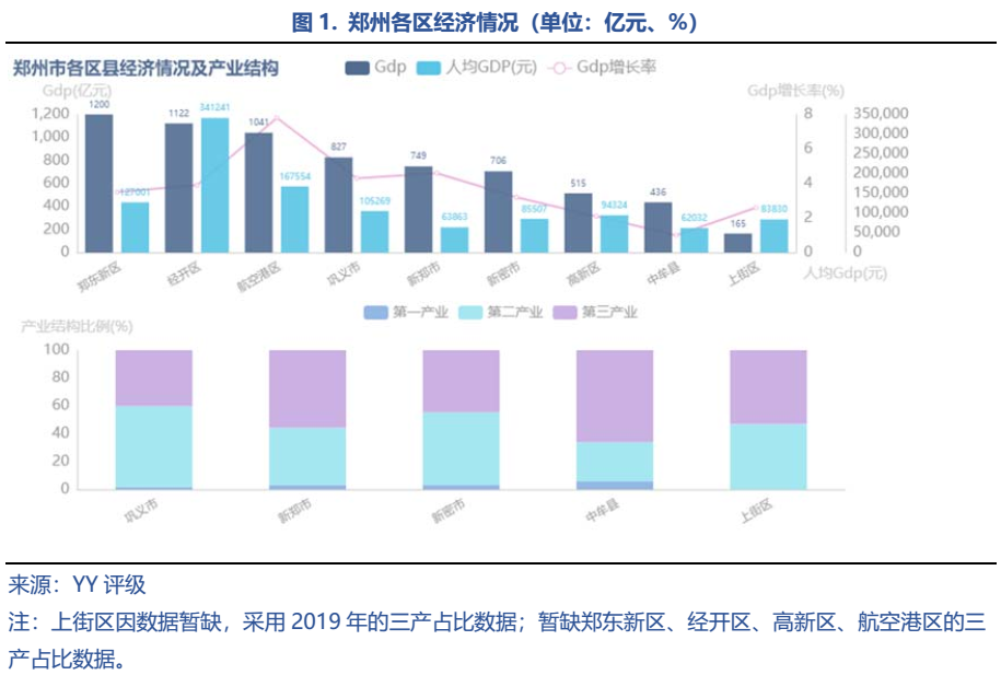 鄭州市現(xiàn)轄6區(qū)5市1縣及鄭州航空港經(jīng)濟綜合實驗區(qū)、鄭東新區(qū)、 鄭州經(jīng)濟技術(shù)開發(fā)區(qū)、鄭州高新技術(shù)產(chǎn)業(yè)開發(fā)區(qū),四大園區(qū)定位各不相同:航空港區(qū)是我國第一個以航空經(jīng)濟為引領(lǐng)的國家級新區(qū);鄭東新區(qū)則是中原經(jīng)濟區(qū)金融集聚核心功能區(qū)、全省推進城鎮(zhèn)化建設(shè)的先行區(qū)和國家大數(shù)據(jù)綜合試驗區(qū)核心區(qū);經(jīng)開區(qū)側(cè)重發(fā)展了汽車及零部件、裝備制造、現(xiàn)代物流三大千億級主導產(chǎn)業(yè);高新區(qū)則定位于“發(fā)展高科技、實現(xiàn)產(chǎn)業(yè)化”,擁有完善的創(chuàng)新孵化培育體系。鄭州共有9個發(fā)債區(qū)縣,在發(fā)債各區(qū)中,鄭東新區(qū)GDP總量領(lǐng)跑,人均GDP位居前三,經(jīng)濟實力較強。以汽車和裝備制造等為主導產(chǎn)業(yè)的鄭州經(jīng)開區(qū)人均GDP一馬當先,高達34.1萬元居全市首位,GDP總量在2019年首破千億大關(guān)的基礎(chǔ)上也再創(chuàng)新高。此外,航空港區(qū)GDP也過千億大關(guān),上街區(qū)、中牟縣和高新區(qū)則以較低的GDP總量居末尾。