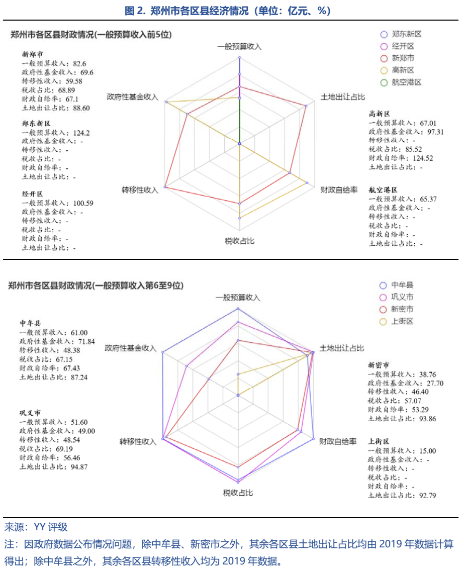截至7月中旬,因鄭州市仍有多個區(qū)縣尚未披露最新的財政預決算報告,2020年的財政數(shù)據(jù)缺失較多,可見鄭州區(qū)域的數(shù)據(jù)披露的及時性和完整性都比較吊車尾。從已有數(shù)據(jù)來看,鄭州各區(qū)中,鄭東新區(qū)和經(jīng)開區(qū)的財政實力最強,為鄭州市2020年一般預算收入超100億元的唯二區(qū)域,但缺乏更多維度的財政數(shù)據(jù)。此外,一般預算收入排名第五的航空港區(qū)同樣缺乏更多的財政數(shù)據(jù)。
