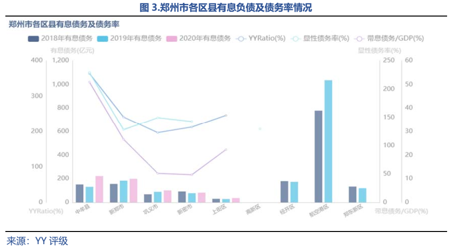 鄭州市總體債務率不高,分區(qū)域看,因發(fā)展需要,航空港區(qū)2018、2019年有息債務“一騎絕塵”,但2020年數(shù)據(jù)尚未披露完整。從目前可得的2020年的債務數(shù)據(jù)來看,中牟縣的帶息債務絕對值和債務率均最高,截至2020年末,中牟縣有息債務余額為222.32億元,YY-Ratio為364.46%,債務風險并不高;新鄭市的有息債務余額和債務率次之;值得注意的是,上街區(qū)的有息債務余額雖然不高,但因財政實力較弱,YY-Ratio較高。