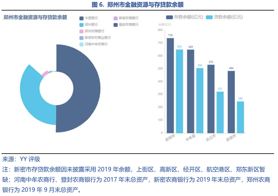 鄭州銀行數(shù)量尚可,但主要是農(nóng)商行,信息披露程度不高。鄭州市共有9家銀行,其中2家城商行(中原銀行和鄭州銀行),7家農(nóng)商行(鄭州農(nóng)商銀行、中牟農(nóng)商銀行、新密農(nóng)商銀行、鞏義農(nóng)商銀行、新鄭農(nóng)村商業(yè)銀行、滎陽農(nóng)商銀行和登封農(nóng)商銀行)。從數(shù)量上看,鄭州市銀行并不少,但以農(nóng)商行為主,財務信息披露不多,除中原銀行、鄭州銀行、新鄭農(nóng)村商業(yè)銀行之外,其余銀行的總資產(chǎn)等數(shù)據(jù)僅可追溯至2017、甚至2011年。2020年末中原銀行和鄭州銀行的資產(chǎn)規(guī)模分別為7,574.82和5,478.13億元,在“中國銀行業(yè)100強榜單”中分別位居第35和42名,金融資源實力較強。