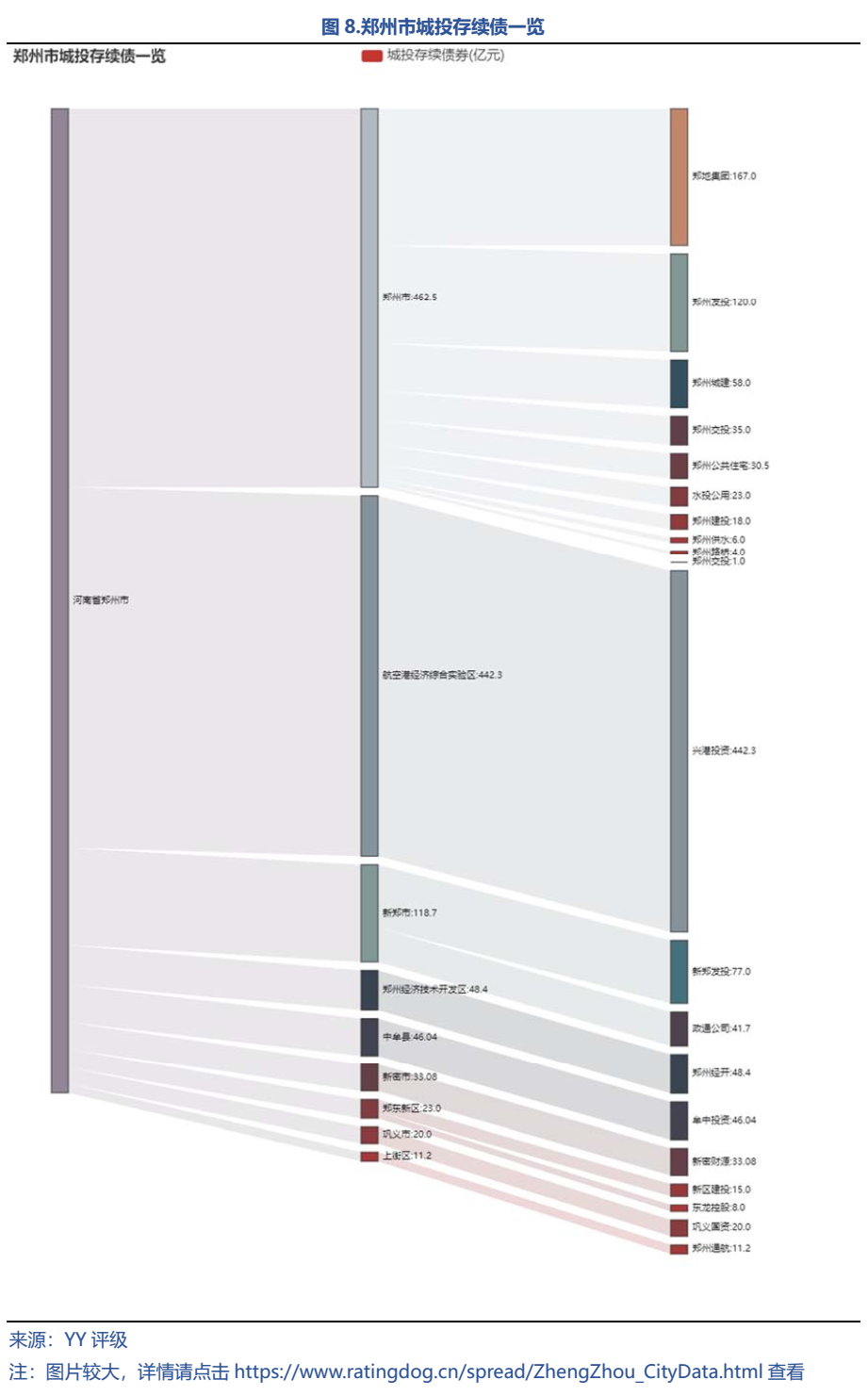 截至2021年7月8日,鄭州市的發(fā)債平臺主要分布在地市級、功能區(qū)和郊縣,平臺存續(xù)債合計規(guī)模超1,200億元。市級平臺債務主要集中在鄭地集團和鄭州發(fā)投,分別占全部市級城投存續(xù)債的36.1%和25.9%;從各區(qū)看,航空港經(jīng)濟綜合實驗區(qū)城投存續(xù)債規(guī)模最大,存續(xù)債券余額有442.3億元,且均屬于興港投資的債務。排第二位的為新鄭市,債務集中在新鄭發(fā)投和政通公司。