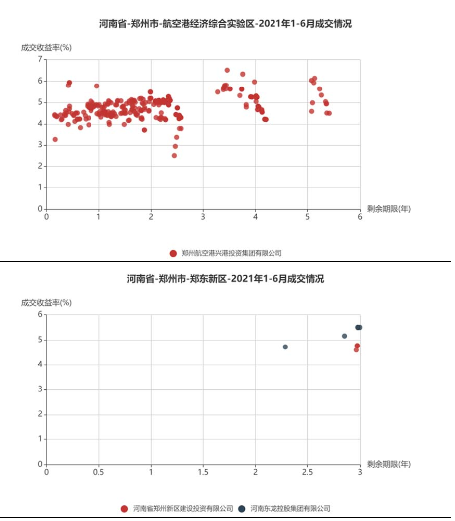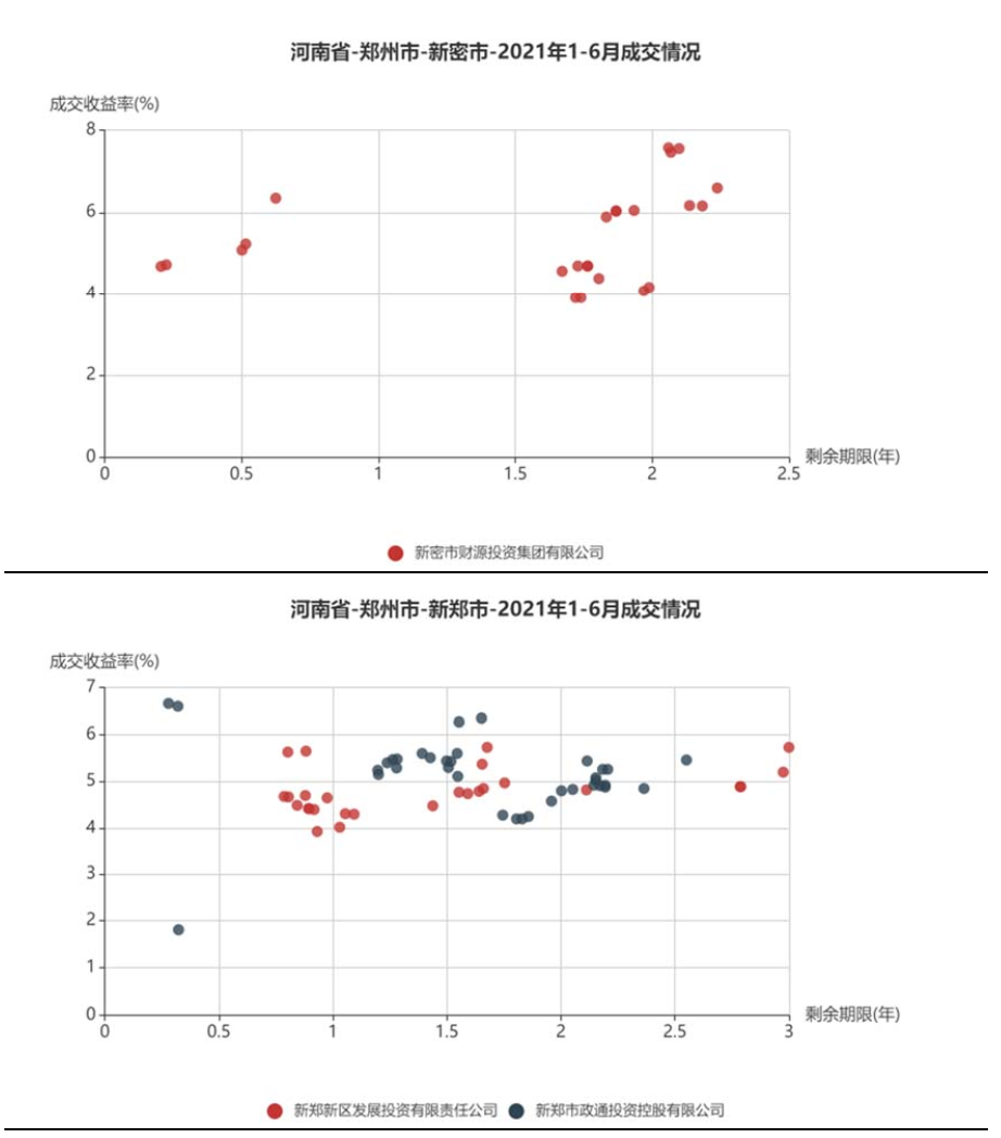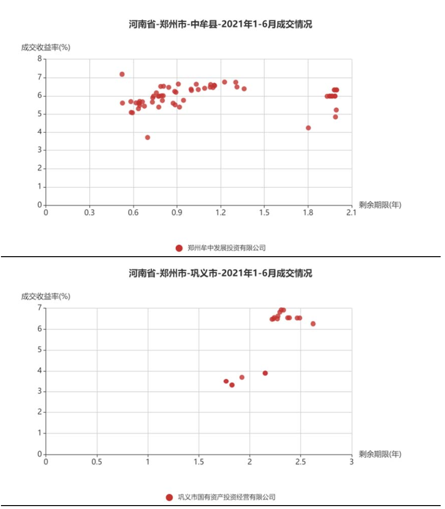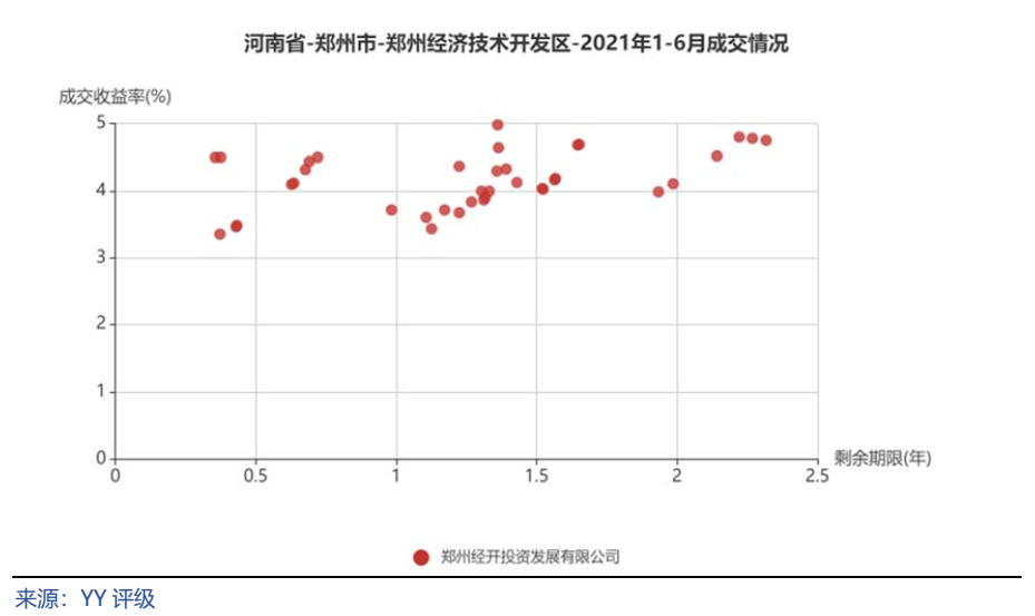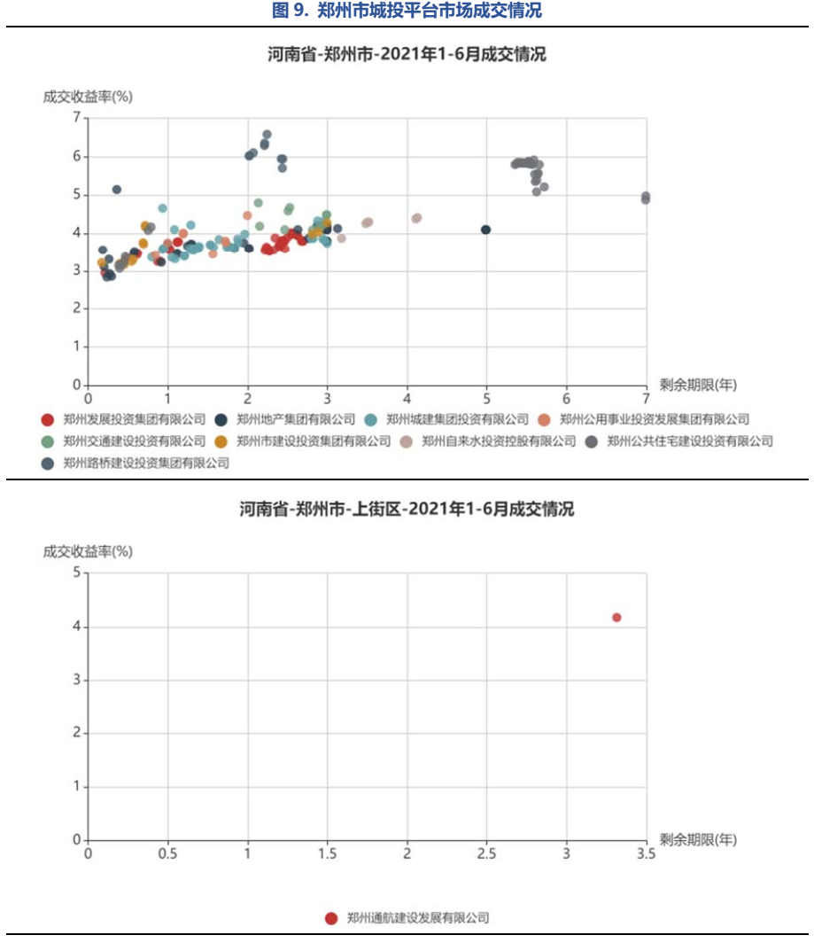 將鄭州市城投平臺按照行政層級和所屬區(qū)域,分為9類分別展示成交情況。具體來看,鄭州市級平臺成交活躍,成交收益率分散在3%~6%,基本隨著剩余期限遞增;中牟縣成交收益率相對較高,在5%~7%;鞏義市分散在3%~4%和6%~7%兩個區(qū)間;新鄭市、航空港區(qū)、鄭東新區(qū)均集中在4%~6%;經(jīng)開區(qū)集中在4%附近;新密市成交收益率相對分散;上街區(qū)僅一個成交主體。