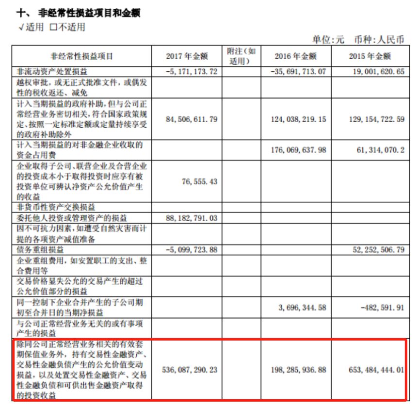 2015-2017年,公司非經(jīng)常性損益合計(jì)約25.63億元,占到同期歸母凈利潤(rùn)的35.67%(追溯調(diào)整后)。