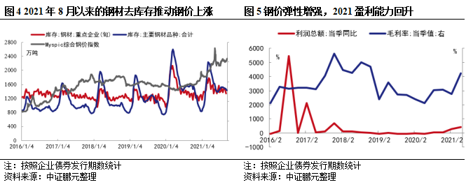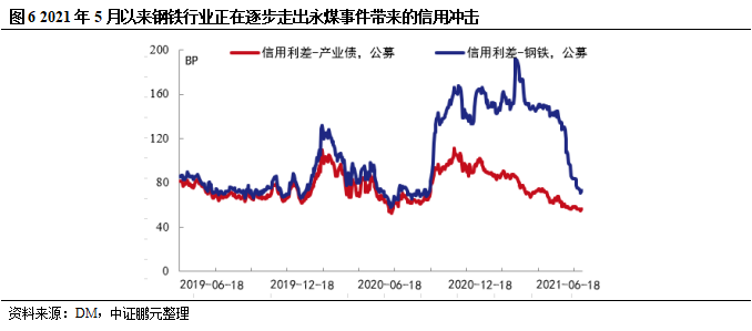 永煤事件后,弱資質(zhì)鋼企信用利差大幅飆升,帶動行業(yè)信用利差走闊。受流動性寬裕影響,今年上半年大宗商品價格創(chuàng)歷史新高,下游較為旺盛的需求支撐鋼企產(chǎn)量大幅提升,帶動行業(yè)現(xiàn)金流及盈利能力明顯回升,鞍鋼集團、重慶鋼鐵等多家鋼企業(yè)績創(chuàng)歷史最佳記錄,統(tǒng)計的23家發(fā)債樣本企業(yè)2021年上半年經(jīng)營活動現(xiàn)金流凈額中位數(shù)同比增長1.16倍、銷售凈利率中位數(shù)上升3.42個百分點至6.64%,流動性壓力下降,5月以來行業(yè)信用利差大幅回落,正在逐步走出永煤事件帶來的沖擊,信用風(fēng)險下降。產(chǎn)量平控疊加能耗雙控措施加碼,行業(yè)景氣周期拉長,有助于鋼企繼續(xù)維持較好的現(xiàn)金流和盈利能力。