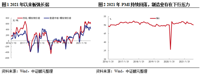 下半年需求仍有支撐,但走勢弱化。在“三道紅線”等政策抑制下,房企融資受限,2021年二季度以來開工數(shù)據(jù)呈疲態(tài),地產(chǎn)需求增量放緩。而今年上半年專項債由于穩(wěn)增長壓力較小發(fā)行進度緩慢,730政治局會議的政策方向由逆周期調(diào)整為跨周期調(diào)節(jié),同時提出合理把握預(yù)算內(nèi)投資和地方政府債券發(fā)行進度,推動今年底明年初形成實物工作量,下半年基建投資更多表現(xiàn)為托而不舉,且政策導(dǎo)向為新基建,對長材需求拉動有限,預(yù)計下半年基建領(lǐng)域支持力度較弱。而機械、汽車、家電等制造業(yè)需求也將回落,雖挖掘機上半年產(chǎn)量仍保持20%以上的增速,但產(chǎn)銷量自5月以來均連續(xù)負增長,汽車由于缺芯限制供給、家電由于出口回落,而鋼鐵主要下游行業(yè)不屬于“兩高”行業(yè),能耗雙控政策其影響較弱,因此我們預(yù)計下半年鋼材需求仍有支撐,但趨勢走弱,板強長弱有望繼續(xù)維持。