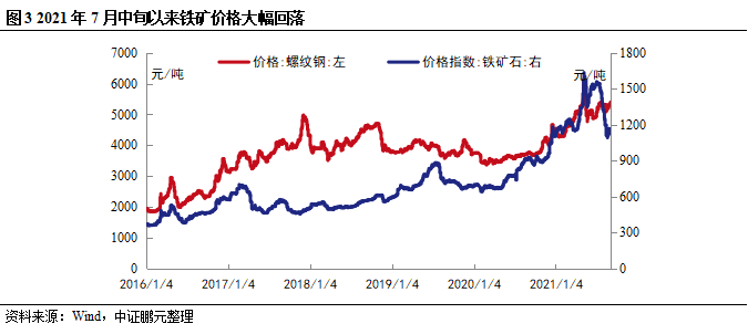 國內(nèi)粗鋼控產(chǎn)量政策落地導(dǎo)致鐵礦價格大幅回落。當(dāng)前對于粗鋼產(chǎn)量平控已基本達成共識,若假設(shè)2021年粗鋼產(chǎn)量不增長,在2021年1-8月粗鋼產(chǎn)量高增長的基數(shù)下,預(yù)計下半年鋼鐵產(chǎn)量需減產(chǎn)4,400萬噸以上,在不考慮港口庫存變化的情況下,按照鐵礦石:粗鋼=1.6:1測算,則下半年鐵礦石需求減少7,060萬噸,則2021年下半年到港鐵礦石將下降19%,中國作為全球鐵礦石最大買家,鐵礦需求下降對礦價造成較大沖擊,鐵礦價格自7月中旬以來已大幅回落,有利于鋼企成本端改善。
