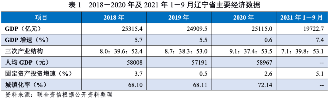 遼寧省地處中國東北邊境,是東北地區(qū)唯一既沿海又沿邊的省份。遼寧省是中國重要的老工業(yè)基地之一,石化、冶金和機(jī)械產(chǎn)業(yè)為遼寧省支柱產(chǎn)業(yè);2020年遼寧省經(jīng)濟(jì)總量仍位于全國中游水平,人均GDP處于全國中下游水平。2020年,遼寧省一般公共預(yù)算收入全國排名第13位,一般公共預(yù)算收入穩(wěn)定性較強(qiáng),但是財(cái)政自給率一般。2018-2020年,遼寧省政府性基金收入快速增長,上級補(bǔ)助收入對地方綜合財(cái)力貢獻(xiàn)程度較大。2020年,遼寧省政府負(fù)債率為36.86%,政府債務(wù)率為128.45%,遼寧省政府負(fù)債水平較高,債務(wù)負(fù)擔(dān)較重。2021年前三季度,遼寧省經(jīng)濟(jì)增速及固定資產(chǎn)投資同比增速均大幅提高;遼寧省一般公共預(yù)算收入和稅收收入同比增速亦均大幅提高。