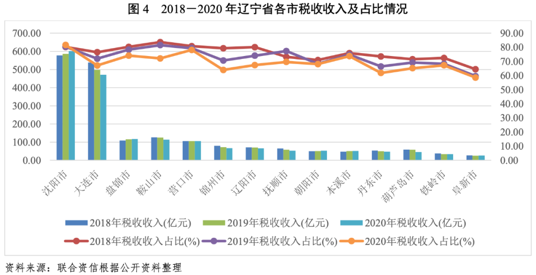 受經(jīng)濟(jì)發(fā)展水平差異影響,遼寧省各市一般公共預(yù)算收入差距較大。2020年,沈陽市和大連市一般公共預(yù)算收入繼續(xù)大幅領(lǐng)先,分別為736.10億元和702.70億元,盤錦市和鞍山市位居全省第三及第四。此外,除營口市和錦州市一般公共預(yù)算收入超百億外,其余各市一般公共預(yù)算收入規(guī)模均低于百億。從一般公共預(yù)算收入構(gòu)成看,2018-2020年,各市稅收收入占一般公共預(yù)算收入的比重變化不大,非稅收入占比大部分控制到40%以下,沈陽市稅收收入占一般公共預(yù)算收入占比最高,達(dá)81.66%。從一般公共預(yù)算收入增速看,2020年盤錦市增速較快,為7.00%,而葫蘆島市的增速為負(fù)(剔除疫情和錦西石化分公司檢修等一次性因素影響,與2019年持平),其余各市的增速均較小。