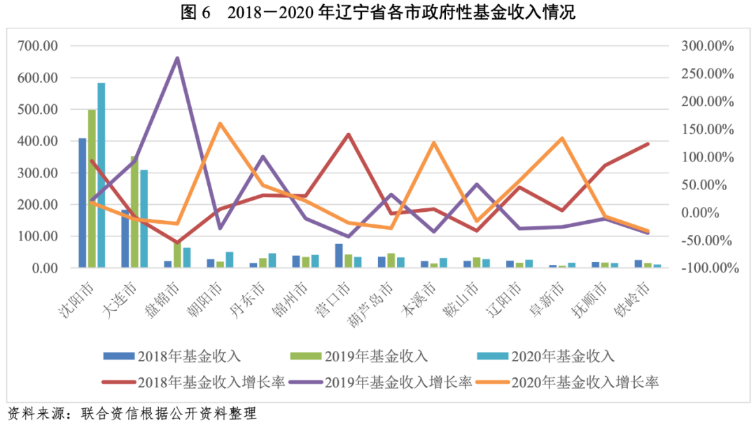 政府性基金收入方面,沈陽市政府性基金收入規(guī)模大,2020年為全省政府性基金收入總額的37.41%,為583.00億元;大連市為308.90億元;盤錦市和朝陽市介于50億元至100億元之間;其余各市規(guī)模均在50億元之下。2020年,大連市、盤錦市、營口市、葫蘆島市、鞍山市、撫順市和鐵嶺市政府性基金收入較2019年有所下降,其他市均有所增長,其中朝陽市、本溪市和阜新市政府性基金收入增幅較大。