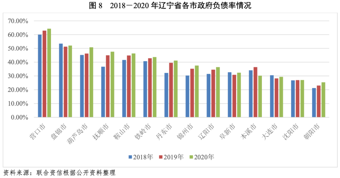 債務(wù)負(fù)擔(dān)方面,截至2020年底,除本溪市外,其余各市政府負(fù)債率較2019年均有所上升,其中,葫蘆島市2020年政府負(fù)債率較上年底提高4.50個(gè)百分點(diǎn),其他市變化不大。從絕對值看,2020年?duì)I口市、盤錦市、葫蘆島市負(fù)債率均在50%以上,分別為64.32%、52.10%和50.79%,列省內(nèi)前三位;大連市、沈陽市和朝陽市負(fù)債率在30%以下,分別為29.36%、27.06%和25.43%,其余市在30%~50%之間不等。整體來看,遼寧省各市債務(wù)負(fù)擔(dān)較較重,營口市、盤錦市和葫蘆島市地方政府債務(wù)負(fù)擔(dān)分列前三,大連市、沈陽市和朝陽市債務(wù)負(fù)擔(dān)相對處于較輕水平。