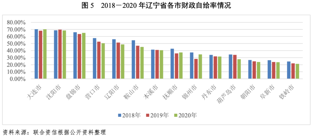 與經(jīng)濟(jì)實(shí)力相匹配,遼寧省各市一般公共預(yù)算收入亦分化明顯,其中沈陽市和大連市一般公共預(yù)算收入較高且穩(wěn)定性較強(qiáng)。2018-2020年,遼寧省內(nèi)各市一般公共預(yù)算收入質(zhì)量整體變化不大;各市財(cái)政自給能力均一般。從各市債務(wù)率看,營口市、盤錦市和鞍山市政府債務(wù)負(fù)擔(dān)遠(yuǎn)高于其他市,其余市中撫順市、大連市、葫蘆島市、遼陽市和錦州市政府債務(wù)負(fù)擔(dān)重。