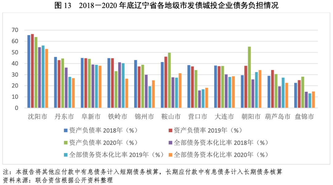 從發(fā)債城投企業(yè)債務(wù)負(fù)擔(dān)來看,2018-2020年,朝陽市、鞍山市和盤錦市發(fā)債城投企業(yè)的資產(chǎn)負(fù)債率有明顯上升,鐵嶺市發(fā)債城投企業(yè)資產(chǎn)負(fù)債率和全部債務(wù)資本化比率有明顯下降,其他地區(qū)發(fā)債城投企業(yè)資產(chǎn)負(fù)債率和全部債務(wù)資本化比率總體呈相對穩(wěn)定或逐步下降趨勢。截至2020年底,沈陽市和朝陽市城投企業(yè)債務(wù)負(fù)擔(dān)相對較重,其他地市資產(chǎn)負(fù)債率均在50%以下。