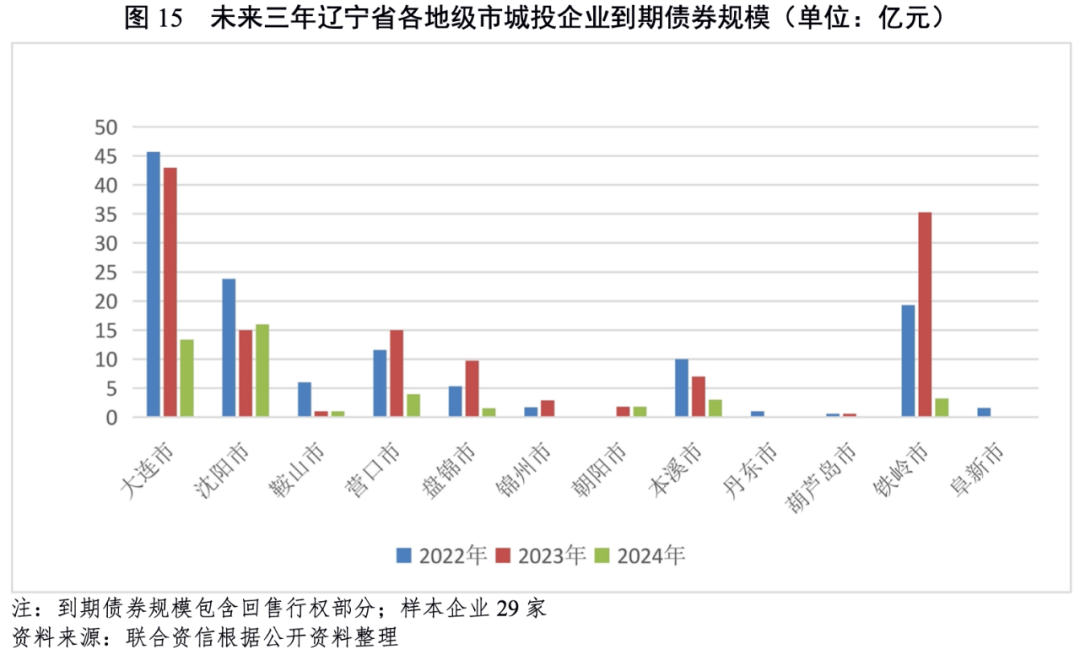 從遼寧省各地級市發(fā)債城投企業(yè)未來三年(2022-2024年)到期債券規(guī)模看,大連市、鐵嶺市和沈陽市的城投企業(yè)未來三年集中到期債券規(guī)模大,其余地市城投企業(yè)到期債券規(guī)模相對較小。