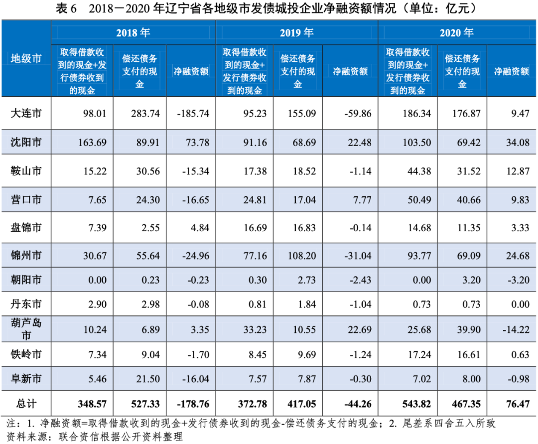 從遼寧省發(fā)債城投企業(yè)對外融資情況來看,考慮到政府注資、往來拆借等行為可能對城投企業(yè)融資活動(dòng)現(xiàn)金流入及流出產(chǎn)生擾動(dòng)影響,本報(bào)告利用“取得借款收到的現(xiàn)金+發(fā)行債券收到的現(xiàn)金”來表示城投企業(yè)從金融機(jī)構(gòu)及債券市場進(jìn)行融資形成的現(xiàn)金流入,利用“償還債務(wù)支付的現(xiàn)金”來表示城投企業(yè)償還剛性債務(wù)形成的現(xiàn)金流出,更為直觀地體現(xiàn)了城投企業(yè)自身融資能力以及金融機(jī)構(gòu)及債券市場對城投企業(yè)的認(rèn)可度。2018-2020年,遼寧省發(fā)債城投企業(yè)“取得借款收到的現(xiàn)金+發(fā)行債券收到的現(xiàn)金”呈現(xiàn)快速增長的態(tài)勢,年均復(fù)合增長24.91%。具體來看,大連市發(fā)債城投企業(yè)“取得借款收到的現(xiàn)金+發(fā)行債券收到的現(xiàn)金”波動(dòng)增長,且2020年融資規(guī)模同比增幅較大,2020年大連市、沈陽市和錦州市發(fā)債城投企業(yè)“取得借款收到的現(xiàn)金+發(fā)行債券收到的現(xiàn)金”金額占遼寧省發(fā)債城投企業(yè)“取得借款收到的現(xiàn)金+發(fā)行債券收到的現(xiàn)金”總額的87.38%;錦州市、營口市和鞍山市發(fā)債城投企業(yè)“取得借款收到的現(xiàn)金+發(fā)行債券收到的現(xiàn)金”持續(xù)增長,且2020年融資規(guī)模同比增幅較大,主要系為應(yīng)對當(dāng)年到期的高額債務(wù)加大了融資力度所致;同期,沈陽市、葫蘆島市和盤錦市發(fā)債城投企業(yè)“取得借款收到的現(xiàn)金+發(fā)行債券收到的現(xiàn)金”均有所波動(dòng),其中,葫蘆島市波動(dòng)下降趨勢明顯,凈融資額亦由正轉(zhuǎn)負(fù)。2018-2020年,遼寧省發(fā)債城投企業(yè)“償還債務(wù)支付的現(xiàn)金”波動(dòng)下降,年均復(fù)合下降5.86%。具體來看,大連市和沈陽市城投企業(yè)“償還債務(wù)支付的現(xiàn)金”均波動(dòng)下降,其中,2019年均出現(xiàn)較大幅度下降,2020年大連市和沈陽市城投企業(yè)支付的現(xiàn)金規(guī)模占遼寧省發(fā)債城投企業(yè)“償還債務(wù)支付的現(xiàn)金”總額的52.70%,大連市發(fā)債城投企業(yè)的凈融資額由負(fù)轉(zhuǎn)正,沈陽市發(fā)債城投企業(yè)的凈融資額持續(xù)為正;錦州市、營口市和鞍山市發(fā)債城投企業(yè)“償還債務(wù)支付的現(xiàn)金”波動(dòng)增長,凈融資額亦呈波動(dòng)態(tài)勢;葫蘆島市發(fā)債城投企業(yè)“償還債務(wù)支付的現(xiàn)金”呈持續(xù)增長態(tài)勢,與其“取得借款收到的現(xiàn)金+發(fā)行債券收到的現(xiàn)金”變動(dòng)趨勢相反,導(dǎo)致其凈融資額由正轉(zhuǎn)負(fù),資金缺口有所擴(kuò)大。總體來看,除葫蘆島市、朝陽市和阜新市外,2020年遼寧省發(fā)債城投企業(yè)凈融資額均呈凈流入,融資環(huán)境有所改善。