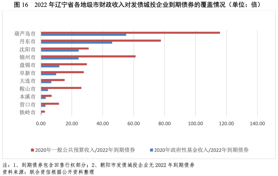 從一般公共預(yù)算收入或政府性基金收入對發(fā)債城投企業(yè)2022年到期債券的覆蓋情況來看,鐵嶺市政府性基金收入對到期債券的覆蓋程度較低,其余地市一般公共預(yù)算收入或政府性基金收入對到期債券的覆蓋程度均較高。