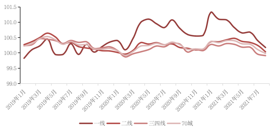 2019年1月以來70城及各能級城市新建商品住宅價格指數(shù)環(huán)比走勢