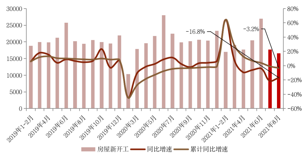 與此同時,單月新開工規(guī)模降至疫后最低。8月全國房企房屋新開工面積16554萬平方米,環(huán)比降6%;較2020年和2019年同期分別下降16.8%和14.7%,是2019年以來月度最低值。