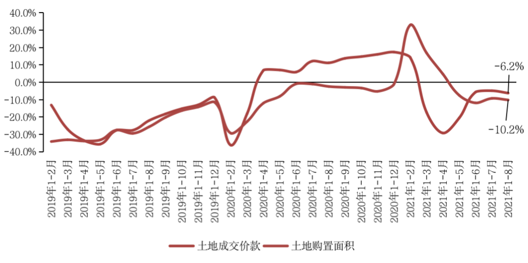 1-8月,房地產(chǎn)開發(fā)企業(yè)土地購置面積10733萬平方米,同比下降10.2%;土地成交價款6647億元,下降6.2%;二者較1-7月降幅分別擴大0.9和1.4個百分點。8月受到多城二輪集中供地規(guī)則調(diào)整,一二線城市土拍量價均延續(xù)低位運行。同時受土地側(cè)調(diào)控進(jìn)一步深入影響,熱點三四線城市8月土拍降溫明顯,如嘉興最近一輪土拍過半數(shù)地塊未達(dá)熔斷階段即成交,3宗宅地更是底價成交。