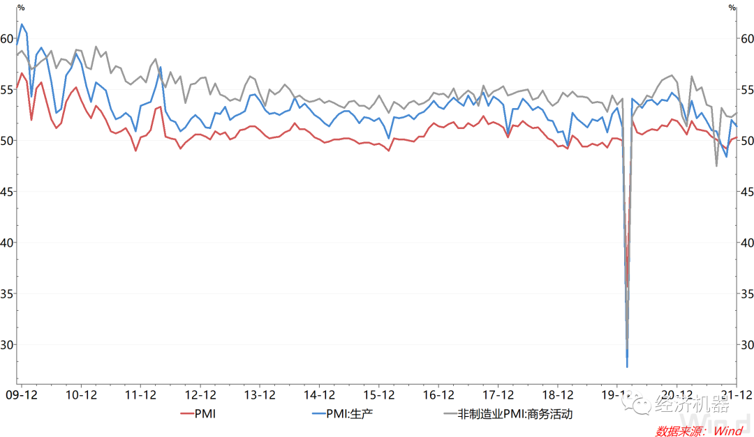 1)制造業(yè)生產(chǎn)動(dòng)能放緩,非制造業(yè)逆勢(shì)復(fù)蘇。12月,PMI整體繼續(xù)回升,但生產(chǎn)分項(xiàng)指數(shù)為51.4%,較上月的52%回落0.6個(gè)百分點(diǎn),表明制造業(yè)生產(chǎn)景氣擴(kuò)張趨緩,可能是由于因限產(chǎn)限電積壓的訂單在上月已基本完成,當(dāng)前生產(chǎn)已基本恢復(fù)常態(tài)。非制造業(yè)商務(wù)活動(dòng)指數(shù)在11月微跌后,于12月回升了0.4個(gè)百分點(diǎn),至52.7%。這在12月疫情外溢蔓延的情況下是難能可貴的,對(duì)經(jīng)濟(jì)穩(wěn)定運(yùn)行提供了重要支持(圖1)。