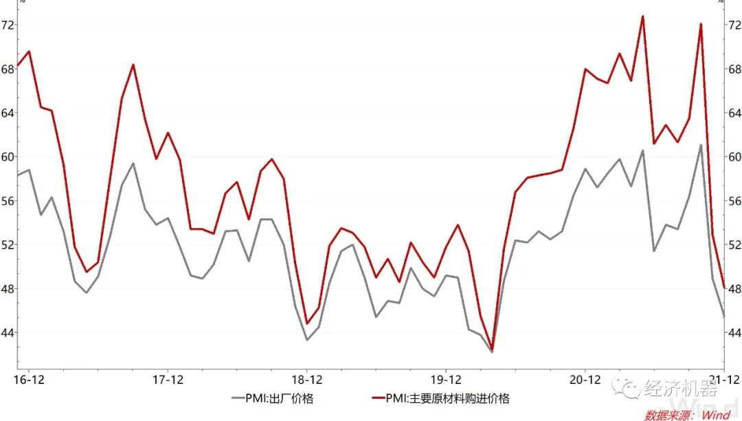 3)工業(yè)生產(chǎn)領(lǐng)域價(jià)格繼續(xù)回落,降幅收窄,原材料價(jià)格走勢(shì)開(kāi)始分化。12月,PMI主要原材料購(gòu)進(jìn)價(jià)格指數(shù)和出廠價(jià)格指數(shù)分別為48.1%和45.5%,較上月繼續(xù)回落,分別下行4.8和3.4個(gè)百分點(diǎn),降幅有所收窄(圖3)。