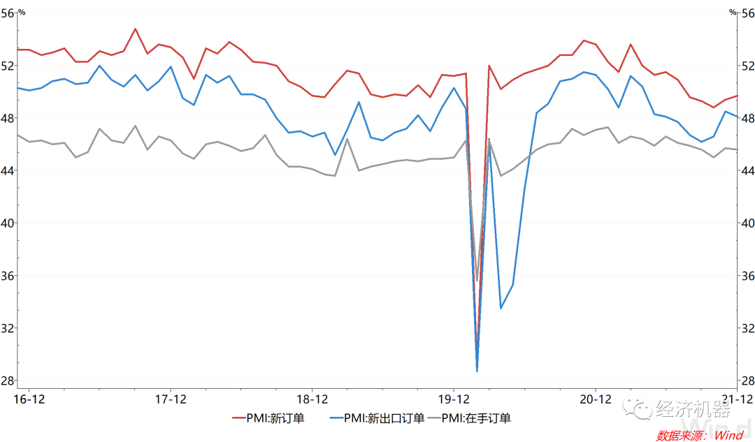 4)新訂單繼續(xù)改善,在手訂單出現(xiàn)回落。12月,PMI新訂單指數(shù)為49.7%,較上月回升0.3個(gè)百分點(diǎn),繼續(xù)改善。其中,新出口訂單為48.1%,較上月回落0.4個(gè)百分點(diǎn),說(shuō)明國(guó)內(nèi)新訂單改善會(huì)更強(qiáng)一些。在手訂單指數(shù)45.6%,較上月回落0.1個(gè)百分點(diǎn)。這可能是由于生產(chǎn)的逐步正常化,積壓的訂單已經(jīng)逐步消化完成,但也從一定上說(shuō)明新訂單增長(zhǎng)并不強(qiáng)勁(圖5)。