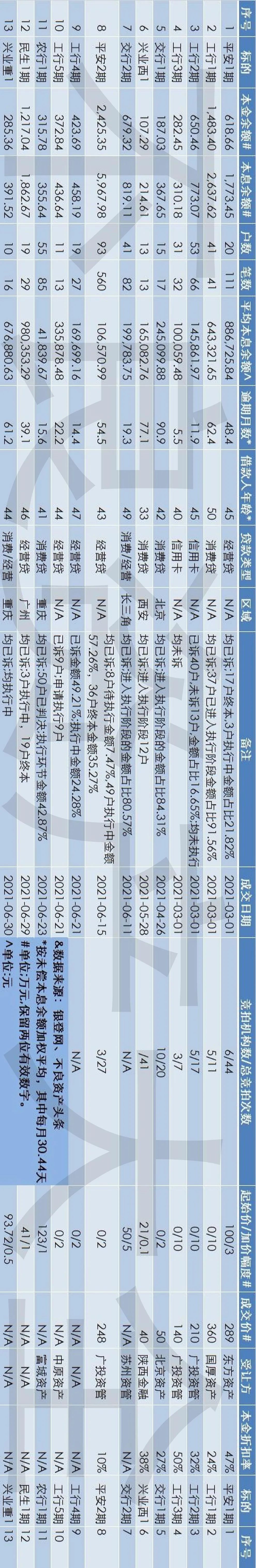 從出讓方角度來看,13期不良資產(chǎn)本金余額中,工商銀行一家機(jī)構(gòu)共5期占比35.51%,平安銀行共2期占比33.64%,其余4家銀行共6期占30.85%。工商銀行共5期,每期不良資產(chǎn)各個維度的參數(shù)都不盡相同且有較大跨度,很明顯在試圖測算需求曲線和市場動向。而平安銀行均為賬齡4年以上的大部分已進(jìn)入執(zhí)行程序的經(jīng)營貸,處置準(zhǔn)核銷不良貸款的意圖很明顯。
