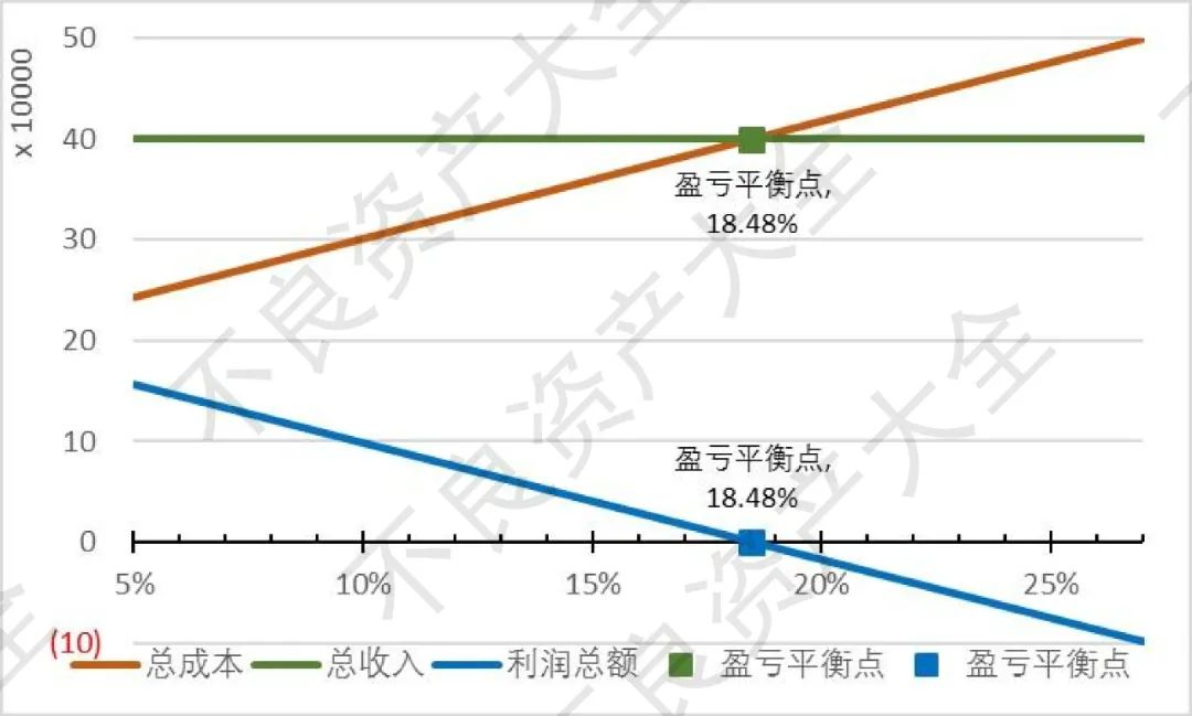 如上圖表,以未償本金余額100萬的銀行個貸不良資產(chǎn)為例,在假設(shè)條件下,理想狀態(tài)達(dá)到盈虧分界點(diǎn)的個貸不良資產(chǎn)價(jià)格約為18.48%.也即,當(dāng)銀行個貸不良資產(chǎn)成交本金折扣率小于18.48%時,該不良資產(chǎn)按假設(shè)條件處置可以盈利,反之反是。