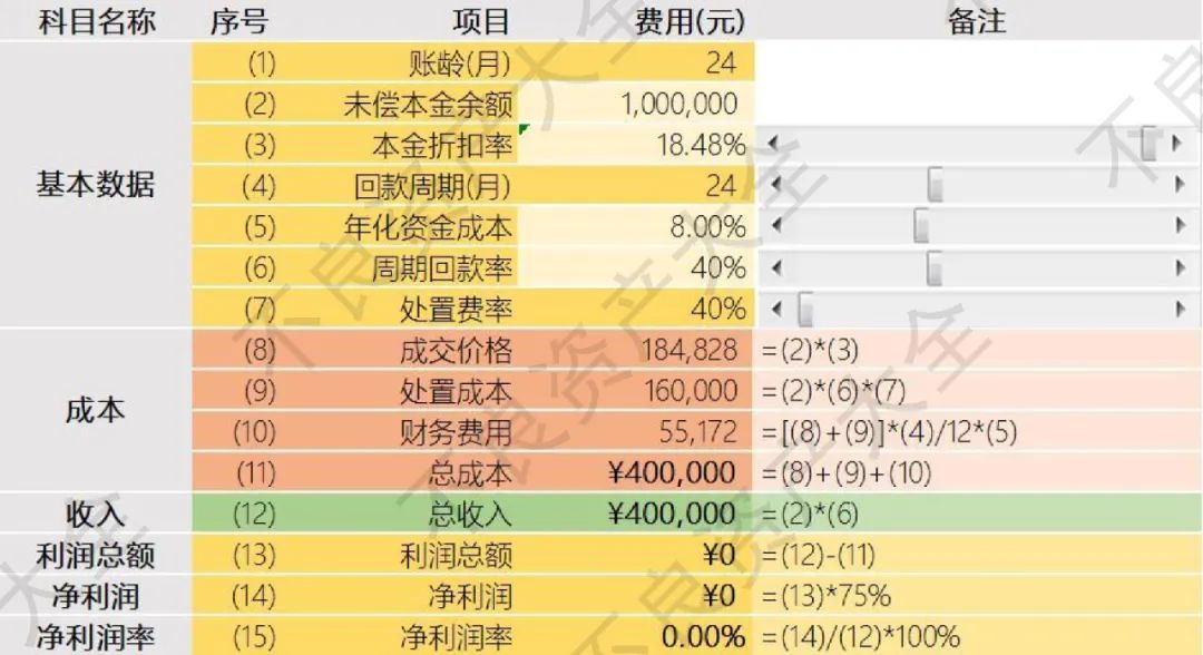 賬齡在24個月以上的銀行個貸不良,目前市場上平均全周期回款率要低于40%,此處按照2年回款率40%計(jì)算。