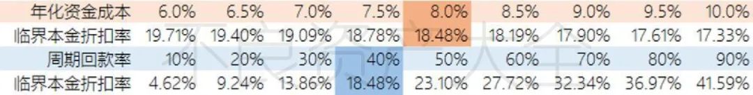 表4-2顯示了在其他假設(shè)條件均不變的情況下,單一因素年化資金成本或周期回款率分別對銀行個貸不良資產(chǎn)盈虧平衡價(jià)格(臨界本金折扣率)的影響。值得注意的是,以目前已經(jīng)成交的銀行個貸不良資產(chǎn)質(zhì)量來看,24個月的周期回款率估計(jì)在10%-40%之間。