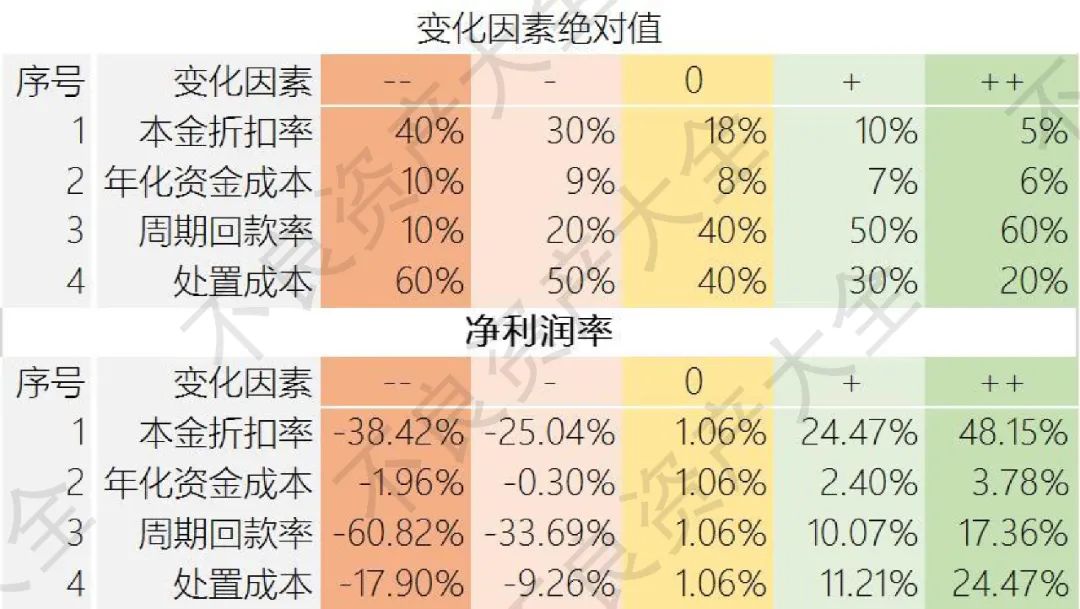 這里要注意的是,對銀行個貸不良而言,無論是催收還是代理訴訟都有比較成熟的市場,因此對于不同賬齡和質(zhì)量的銀行不良資產(chǎn)包,其處置成本都有較為固定的市場價(jià)格。表5-1中將處置成本也作為變化因素做敏感性分析,主要原因其一是以目前一級市場成交情況來看,標(biāo)的質(zhì)量參差不齊。其次是不同資產(chǎn)管理公司自行處置對于處置成本的把控也不盡相同。