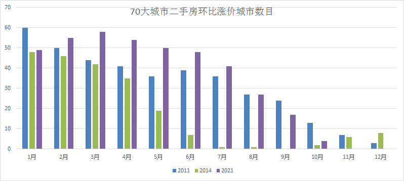 其次,此輪地產(chǎn)降溫前,房地產(chǎn)需求端數(shù)據(jù)好于前兩輪(2011、2014)。從圖中可以看到,在降溫前,當前房價上漲城市數(shù)目是明顯高于2011和2014年的。