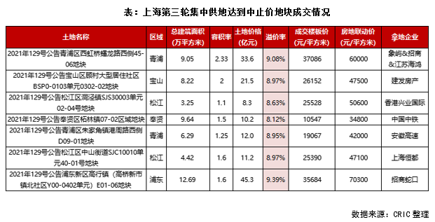 第三輪集中供地中,上海有9宗較為優質的地塊達到設定的“中止價”,平均成交溢價率在8-9%左右: