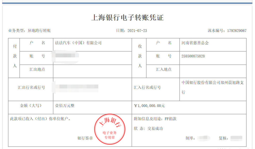 值得一提的是,此次河南災(zāi)情,法法汽車(中國)汽車有限公司也向河南省慈善總會捐款100萬元。賈躍亭還@河南省慈善總會表示,“我們剛起步,盡一點綿薄之力。成為一家上市公司只是FF的開始,構(gòu)建共享共創(chuàng)的出行未來才是我們的使命。”