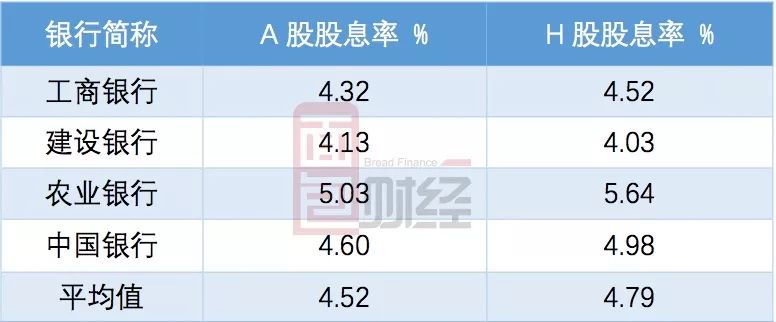經(jīng)過6月上旬以來的持續(xù)下跌,4大行全年漲幅悉數(shù)被“沒收”。隨著股價下跌,一向分紅穩(wěn)定的四大行股息率終于集體回歸“4時代”——年度分紅超過股價的4%,無論A股還是H股皆如此。下表是四大行以2018年6月26日收盤價計算的股息率: