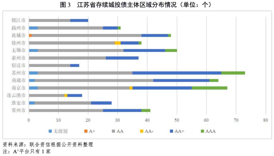 江蘇省作為國(guó)內(nèi)城投債存量規(guī)模最大的省份,發(fā)債城投企業(yè)數(shù)量最多,蘇南與蘇北地區(qū)發(fā)債城投企業(yè)主體信用水平分化較為明顯。