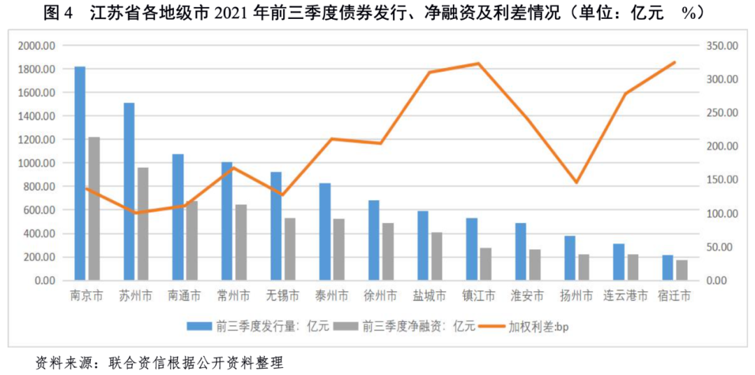從債券發(fā)行來(lái)看,2021年前三季度江蘇省合計(jì)發(fā)行城投債規(guī)模10355.57億元,居全國(guó)首位。省內(nèi)看,南京、蘇州發(fā)行規(guī)模均超過(guò)1500億元,南京市發(fā)行規(guī)模最大,超過(guò)1800億元,其次為南通、常州市,超過(guò)1000億元;宿遷、連云港、淮安及揚(yáng)州發(fā)行規(guī)模較小,均低于500億元,宿遷新發(fā)規(guī)模最小;其他地級(jí)市發(fā)行規(guī)模位于500~1000億元之間,省內(nèi)債券新發(fā)整體集中于蘇南地區(qū)。