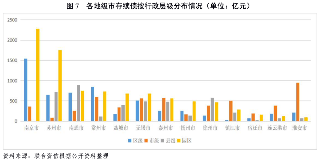 江蘇省城投債發(fā)行及存續(xù)規(guī)模大,主要集中于蘇南地區(qū),南京市新發(fā)及存續(xù)規(guī)模最大,宿遷市最小。蘇南地區(qū)城投債發(fā)行成本優(yōu)勢(shì)明顯,宿遷市、鎮(zhèn)江市和鹽城市發(fā)債成本省內(nèi)相對(duì)較高;蘇南地區(qū)存續(xù)城投債信用等級(jí)整體高于蘇中及蘇北地區(qū),徐州、揚(yáng)州及宿遷市存續(xù)債以AA級(jí)為主;蘇南地區(qū)低行政層級(jí)的城投企業(yè)存續(xù)債規(guī)模高于蘇中及蘇北地區(qū),其中南京市、蘇州市和無(wú)錫市以園區(qū)級(jí)發(fā)債城投企業(yè)為主,下沉程度較高。